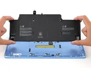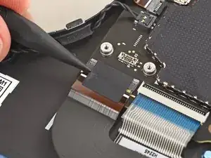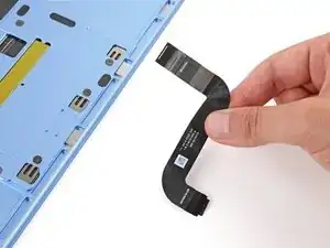 Правая сторона кабеля трекпада закреплена с помощью прочного клея. Нагрев кабеля размягчает клей, облегчая его отделение.