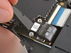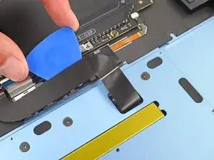 Используйте плоский конец лопатки, чтобы приподнять откидывающуюся фиксирующую защелку ZIF‑разъема кабеля трекпада, расположенного на самом трекпаде.