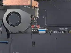При сборке снова подключите кабель трекпада к его ZIF‑разъёму на материнской плате. Затем плотно прижмите правую сторону кабеля, чтобы закрепить его клеем.