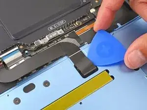 Осторожно подведите остриё лопатки под кусочек скотча на ZIF‑разъёме кабеля трекпада, рядом с нижним левым углом материнской платы.