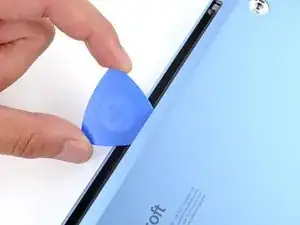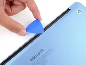Вставьте кончик медиатора под верхний край нижней крышки примерно на дюйм (2,5 см) влево или вправо от логотипа Microsoft.