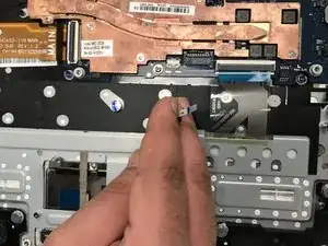 Аккуратно снимите разъём между трекпадом и материнской платой, потянув его вверх у гнезда.