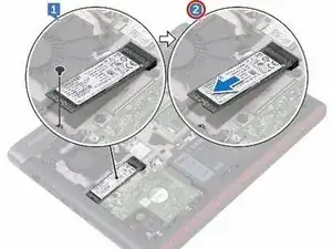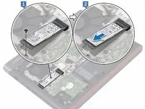 Удалите винт (M2x3), который крепит твердотельный накопитель к базе компьютера.