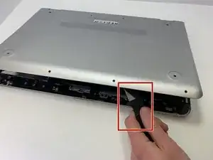 Вставьте лопатку между рамкой ноутбука и съемной крышкой и снимите крышку с устройства.