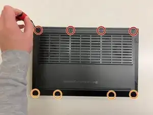 Выверните четыре винта 8 мм на задней крышке ноутбука с помощью отвёртки Phillips #1.
