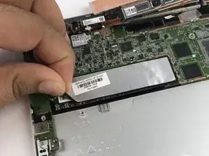 Отключите кабель экрана и батареи. Используйте лопатку, чтобы обнажить клейкую полоску, и аккуратно снимите её.