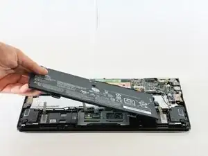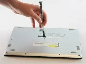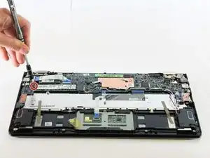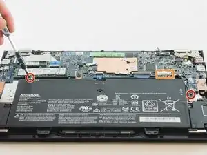 Удалите два винта Phillips #1 длиной 3 мм, удерживающие аккумулятор на шасси ноутбука.