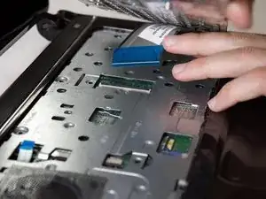 Отключите кабель, подняв белый язычок у основания кабеля ногтем и затем аккуратно потяните за синюю часть кабеля.