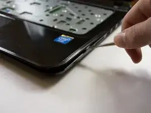 Переверните компьютер и с помощью металлического инструмента для демонтажа снимите пластиковую сборку подставки для ладоней.