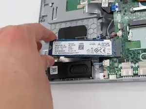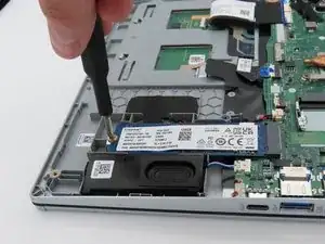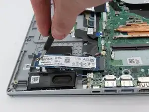 Крестообразной отвёрткой Phillips #0 выкрутите маленький винт длиной 4,5 мм, фиксирующий твердотельный накопитель к корпусу ноутбука.