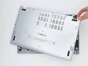 Нижняя панель ослаблена. Снимите её, потянув вверх и в сторону от ноутбука, и отложите в сторону.