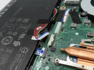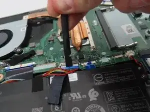 Используйте пластиковую лопатку, чтобы ослабить чёрную ленту вокруг большого разъёма батареи на материнской плате.