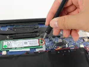 Удалите черный винт с крестообразной головкой #000 длиной 4 мм справа от SSD.