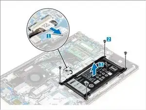 Удалите винты, фиксирующие батарею в компьютере [2].