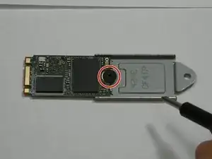 С помощью отвертки Phillips #2 удалите один винт размером 3,0 мм из крепления SSD.