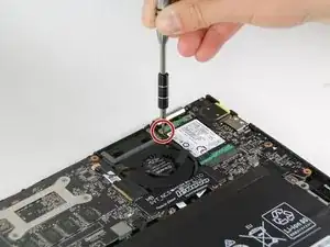 Отверткой Phillips #00 отвинтите один винт 3/16" в верхнем левом углу твердотельного накопителя.