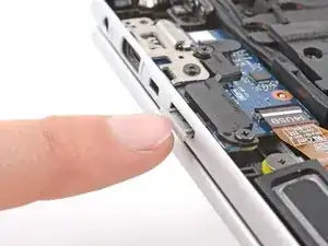 Плата разъёма расположена с той же стороны ноутбука, что и аудиогнездо. Она включает слот для SIM‑карты и один порт USB‑A.