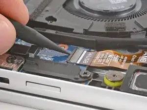 Используйте лопатку, чтобы поднять откидную защёлку на ZIF‑разъёме аудиогнезда, расположенном в верхнем левом углу ноутбука.