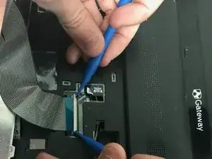 Нажмите по бокам на чёрный ленточный кабель двумя пластиковыми инструментами для вскрытия, чтобы освободить его.