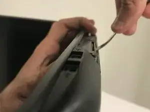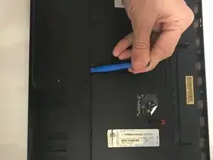 Снимите крышку дисковода на правой стороне ноутбука, используя пластиковый инструмент для вскрытия.