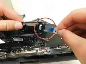 Чтобы отключить ленточный разъём, отогните вверх чёрную фиксационную защёлку, показанную на изображении.