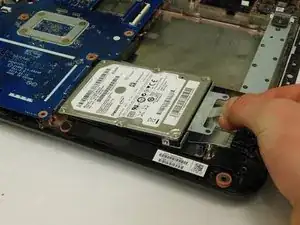 Снимите 2 чёрных винта, удерживающих жёсткий диск в рамке компьютера.