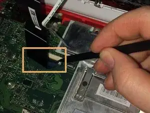 Отключите широкий шлейф, подняв крышку и вытащив его из разъема материнской платы к батарее с помощью лопатки.