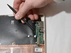 Вставьте и слегка поверните пластиковый инструмент для открытия, чтобы отделить и удалить крышку задней панели Chromebook от корпуса.
