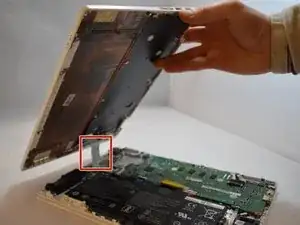 Не удаляйте крышку сразу же. Питательная лента удерживает крышку прикреплённой к остальной части ноутбука. Аккуратно поднимите крышку со стороны кнопки питания и установите её рядом с корпусом ноутбука.