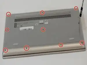 Удалите 10 серебристых винтов с нижней части ноутбука.