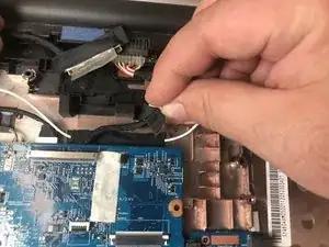 Отсоедините ленту, которая закрепляет белый антенный кабель к материнской плате.