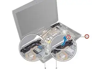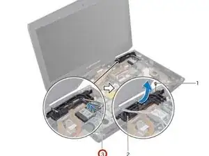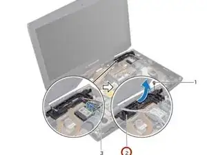 Обратите внимание на прокладку антенных кабелей, затем снимите кабели с направляющих на основании компьютера.