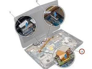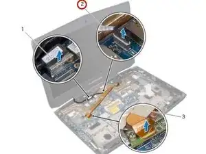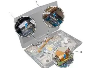 Потяните за язычок, чтобы отсоединить кабель дисплея от соответствующего разъёма на системной плате.