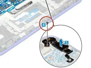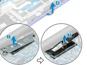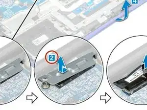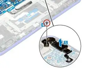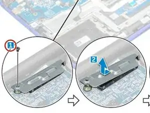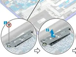 Удалите винт M1.6xL2, фиксирующий металлическую скобу, закрывающую разъем кабеля дисплея.