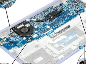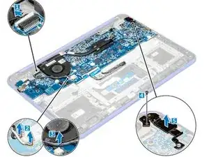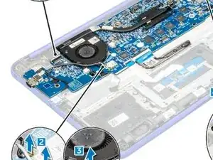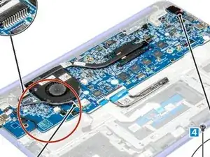 Проложите кабель карты WLAN по направляющему на вентиляторе, затем снова подключите антенные кабели к карте WLAN.