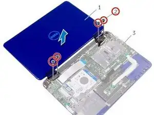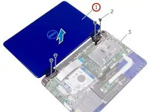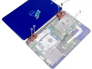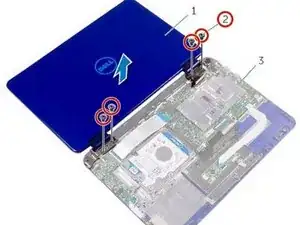 Удалите винты, фиксирующие узел дисплея к корпусу подлокотника и клавиатуры.
