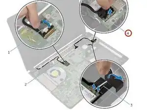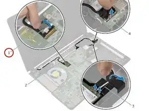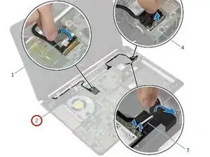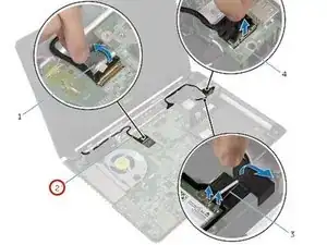 Отметьте маршрут прокладки кабеля дисплея и снимите кабель с направляющей.