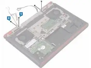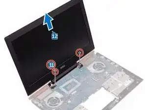 Установите два винта (M2.5x5), которые фиксируют узел дисплея к основанию корпуса компьютера.