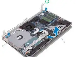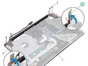Удалите винты, фиксирующие петли дисплея к опоре для запястий и узлу клавиатуры.