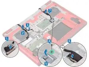 Удалите винт (M3x3), который фиксирует кронштейн кабеля дисплея к системной плате.