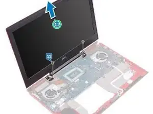 Замените два винта (M2.5x5), которые фиксируют узел дисплея к основанию корпуса компьютера.
