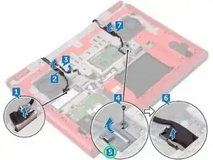 Приклейте кабель дисплея и кабель камеры к основанию корпуса компьютера.
