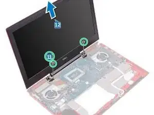 Замените два винта (M2x3), которые фиксируют узел дисплея к основанию корпуса компьютера.