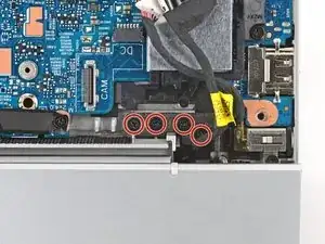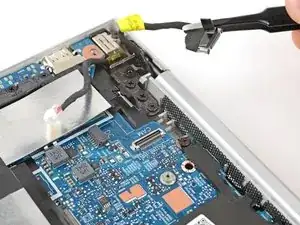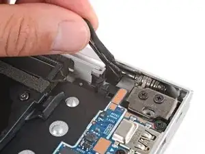 Используйте остриё лопатки или ноготь, чтобы поочерёдно надавливать на стороны скользящего разъёма питания, пока он полностью не выйдет из гнезда рядом с левым шарниром.