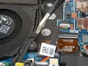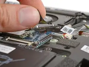 Подденьте одним из рычагов угловых пинцетов металическую шейку одного из коаксиальных разъёмов на модуле WLAN (Wi‑Fi), расположенном прямо под вентилятором.