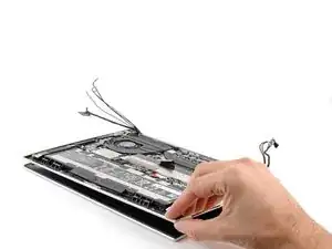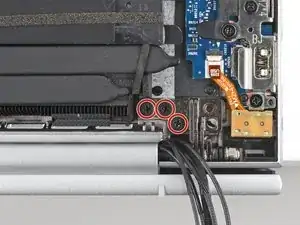 Пальцами вытащите кабель дисплея и два коаксиальных кабеля из их зажимов вдоль верхнего края ноутбука.