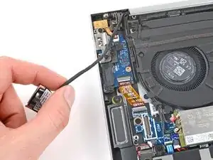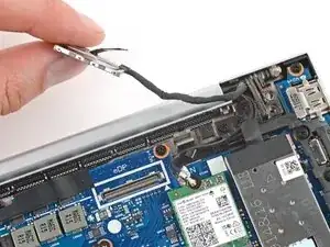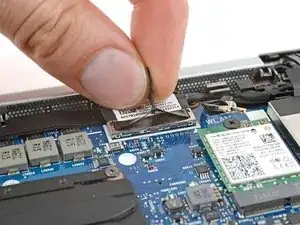 Сдвиньте одну из ветвей изогнутых пинцетов под металлическую ножку одного из коаксиальных разъёмов на модуле WLAN (Wi‑Fi), рядом с правым шарниром.