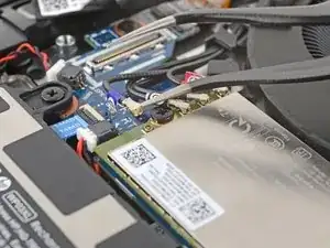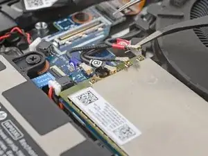 Просуньте одну сторону изогнутых пинцетов под металлическую шейку одного из коаксиальных разъёмов на модуле WWAN (сотовая связь).