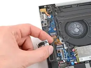 Пальцами возьмитесь за пластиковую вынимающуюся петлю левого кабеля дисплея с нажимным разъёмом, расположенного под вентилятором.