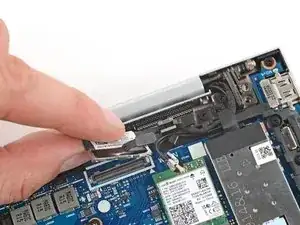 Удерживая пластиковую вкладку на правом кабеле дисплея нажимного разъёма пальцами, расположенном рядом с правым шарниром, захватите её.